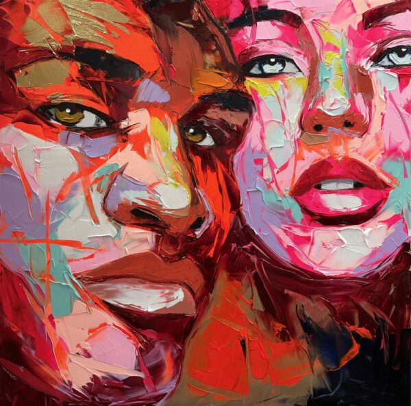 Peindre est chez elle un acte instinctif et viscéral. Le couteau remplace le pinceau, la matière devient vivante, l’huile se heurte à la toile avec intensité. Dans cet équilibre entre maîtrise et impulsion, elle crée des visages puissants, traversés par la lumière, la force et une fragilité palpable.