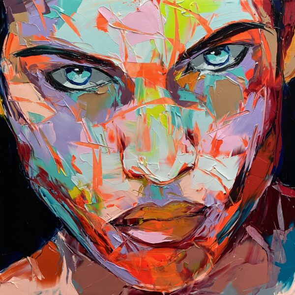 Peindre est chez elle un acte instinctif et viscéral. Le couteau remplace le pinceau, la matière devient vivante, l’huile se heurte à la toile avec intensité. Dans cet équilibre entre maîtrise et impulsion, elle crée des visages puissants, traversés par la lumière, la force et une fragilité palpable.