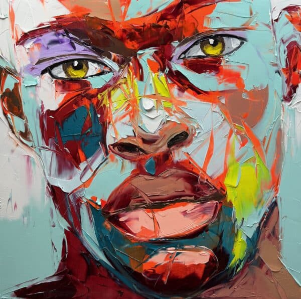 Peindre est chez elle un acte instinctif et viscéral. Le couteau remplace le pinceau, la matière devient vivante, l’huile se heurte à la toile avec intensité. Dans cet équilibre entre maîtrise et impulsion, elle crée des visages puissants, traversés par la lumière, la force et une fragilité palpable.