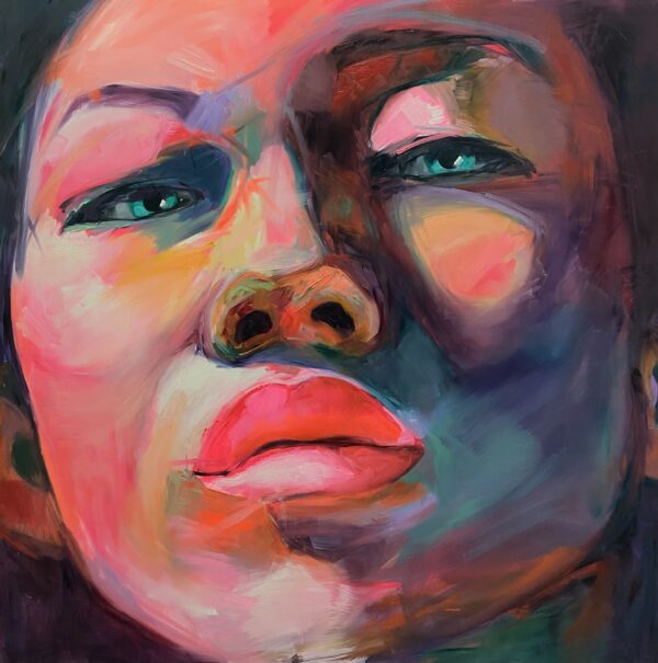Peindre est chez elle un acte instinctif et viscéral. Le couteau remplace le pinceau, la matière devient vivante, l’huile se heurte à la toile avec intensité. Dans cet équilibre entre maîtrise et impulsion, elle crée des visages puissants, traversés par la lumière, la force et une fragilité palpable.